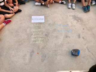 A continuación os quiero mostrar como hemos trabajado algunos contenidos de tercero de primaria tanto en Ciencias Naturales como en Ciencias Sociales, en primer lugar escribimos los 5 reinos de los seres vivos en los cinco dedos, puede parecer una tontería pero creo que es una forma divertida y anecdótica de que no se les olvide que son 5, es cierto que se mancharon las manos, pero mancharse las manos aprendiendo no creo que sea del todo malo, por otro lado les di la posibilidad de que trajeran un trompo a clase para simular el movimiento de rotación de la tierra, ese día nos salimos al patio e hicimos un circulo, después de tirar los trompos y explicar los movimientos de la tierra realizamos un pequeño esquema con tizas de colores. Se lo pasaron genial. Todo lo que sea aprender lejos del método tradicional sentados sin moverse y leyendo un papel les motiva muchísimo aunque no siempre es posible, pero una buena idea es ir alternando. Por último os enseño un libro que trajo con mucha ilusión un niño de segundo de primaria, el cual estuvimos viendo en clase. Aprovecho para decir que cualquier cosa relacionada con estas asignaturas que les haga ilusión llevar a clase siempre serán bienvenidas, ya sea un libro, una foto de algún museo o excursión, minerales... cualquier cosa será bien recibida.